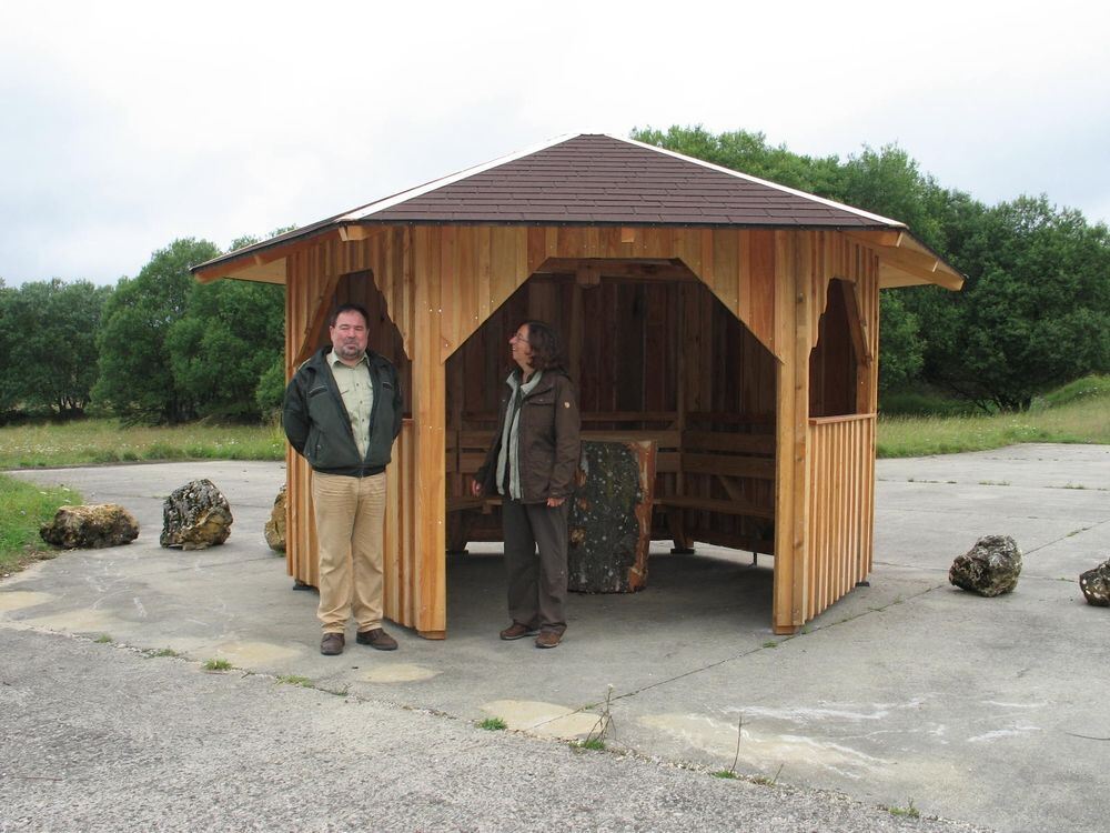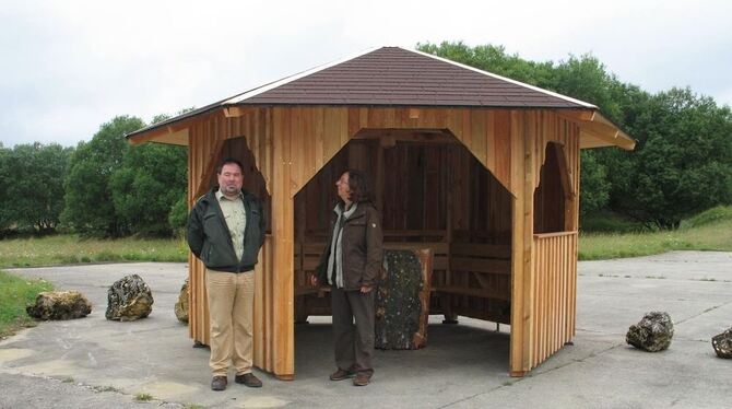 Lydia NIttel und Walter Krug präsentieren die beiden neuen Holzpavillons am Trailfinger Kopf (Foto) und Grimmelsberg, die Besuchern vom windgeschützten Plätzchen aus herrliche Aussichten auf die einmalige Landschaft des Münsinger Hardts bieten. GEA-FOTO: GEIGER