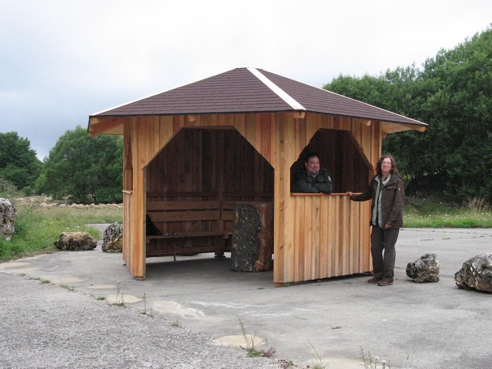 Lydia Nittel und Walter Krug präsentieren die beiden neuen Holzpavillons am Trailfinger Kapf (Foto) und Grimmelsberg, die Besuchern vom windgeschützten Plätzchen aus herrliche Aussichten auf die einmalige Landschaft des Münsinger Hardt bieten.