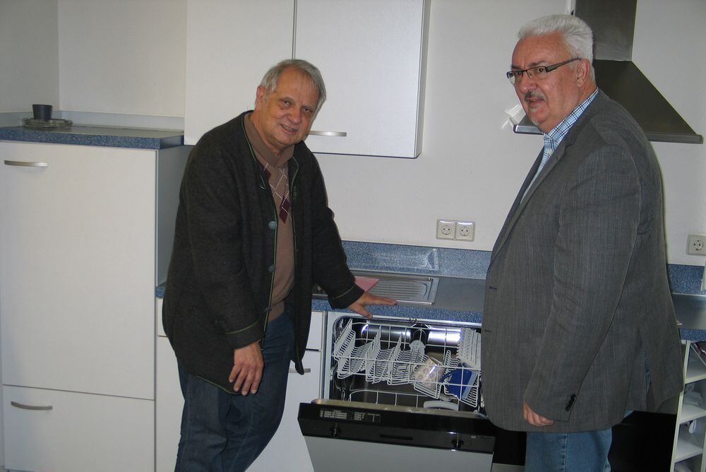 Zwei Männer in der Küche? Karl Zahradnik, links, und Wolfgang Althoff kennen sich aus und beraten ehrenamtlich Interessenten auch in Münsingen, was sie für mehr Sicherheit und Komfort im Alter in ihrer Wohnung auch sonst noch alles verändern können. GEA-FOTO: OEL