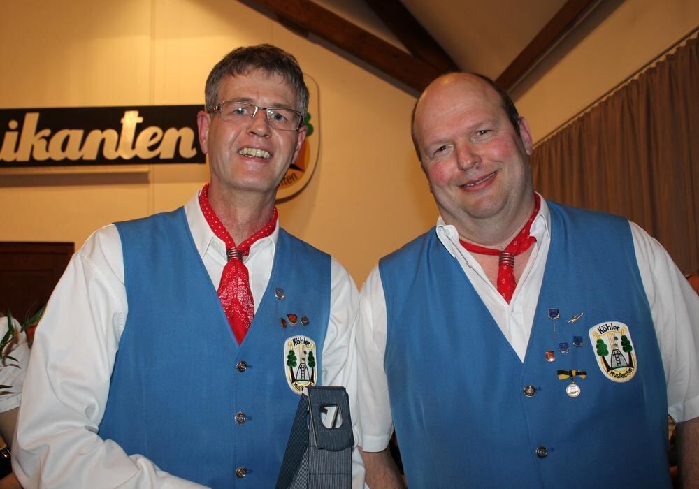 Kurt Class (rechts) und Bernd Schmid sind seit 40 Jahren Köhlermusikanten. Dafür gab es die Ehrennadel in Gold mit Diamant. Für 20-jährige Mitgliedschaft wurden Harald Dürr, Beate Failenschmid, Sabine Heinzmann, Kathrin Schneider und Siglinde Senskamit der Ehrennadel in Silber geehrt. Und für 10 Jahre:Tanja Failenschmid, Alexander Schenk und Lisa- Sophie Wüstner. FOTO: BLOCHING