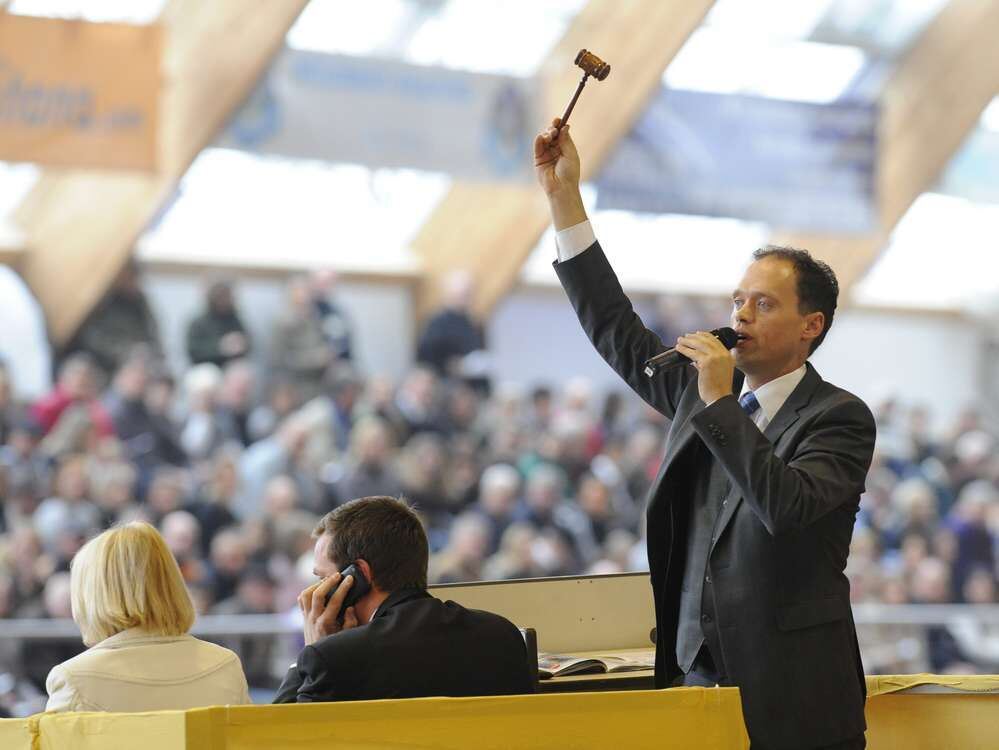 Hendrik Schulze Rückamp bringt Pferde »unter den Hammer«. Sein Job ist es aber nicht nur, möglichst gute Preise zu erzielen. Ein Auktionator ist immer auch Moderator: Er muss sein Publikum unterhalten und fachliche Informationen charmant, aber seriös vermitteln.FOTO: ROBERT KRAFT