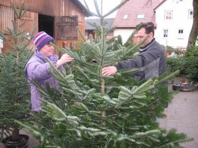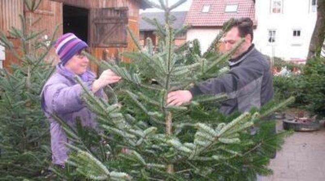 Nicht nur die Größe, auch die schöne Spitze bestimmt den Preis eines Christbaums, erklärt Inge Heinzmann einem Kunden auf ihrem Hof-Weihnachtsbaummarkt in Kohlstetten, der zwei Wochen vor dem Fest eine große Auswahl bietet.