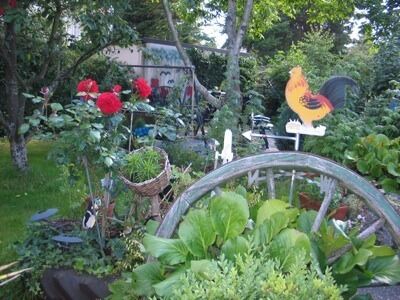 Grüne Inseln rund um die Obstbaumwiese: Für dekorative Elemente hat Anni Walter etwas übrig. Sie bringt selbst alte Kessel zum Wuchern.