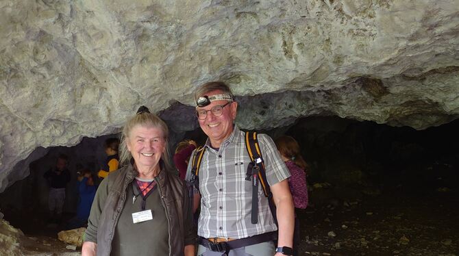 Alb-Guide Maria Tittor mit dem Landtagsabgeordenten Rudi Fischer in der Bettelmannshöhle.