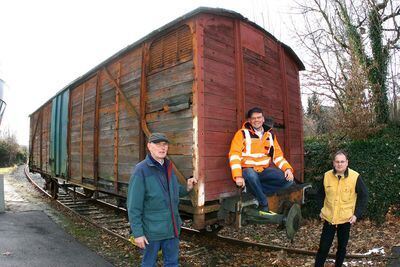 Der Güterwagen, Baujahr 1896, neueste Erwerbung der Schwäbischen Alb-Bahn, steht derzeit auf dem Gelände der Stadtwerke/Fair-Energie Reutlingen. Dieter Lass (von links) von der Stadt Reutlingen hat es möglich gemacht, den Waggon dort zwischenzuparken. Bernd Matthias Weckler, Vorsitzender des Vereins Schwäbische Alb-Bahn, ist erfreut über die Unterstützung von Frank Walker.