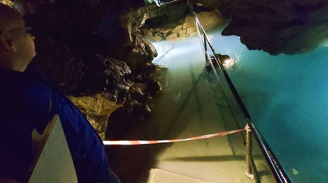Der unterirdische See in der Nebelhöhle führt nach dem starken Regen so viel Wasser, dass er über die Ufer getreten ist. Die Höhlenführer haben den überschwemmten Weg abgesperrt.