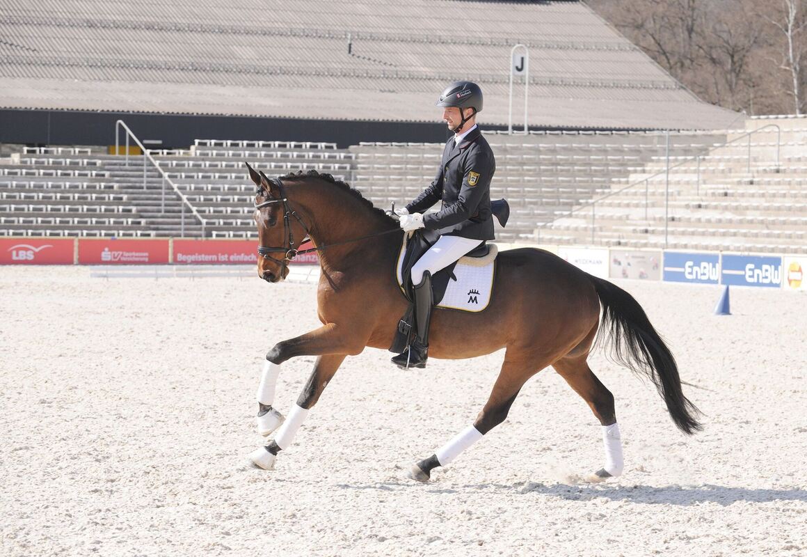 Der bewegungsstarke vierjährige Trakehner Flour/T., ein Sohn des Eliteanwärters Helium/T. aus der Zucht von Dirk Vester in Hennef und dem Besitz des Haupt- und Landgestüt Marbach, wurde in einen Aachener Ausbildungsstall verkauft.