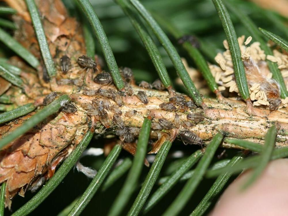 Braunbepuderte Fichtenläuse saugen ihren Eiweißbedarf mit dem Saft der Nadelbäume ein. Als Dankeschön gibt es, wenn die Lebens- und Arbeitsbedingungen stimmen, süßen Honigtau, den sich die Bienen aus den Wäldern holen. FOTO: FRANK MIKLEY/WIKIPEDIA