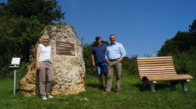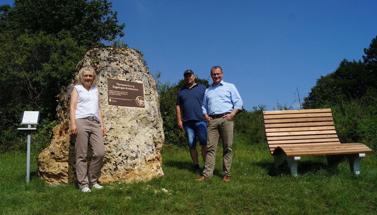 Doris Wüllner (Landratsamt), Kurt Class (Teilnehmergemeinschaft) und Bürgermeister Mario Storz mit Plakette.