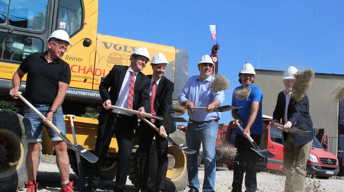 Mit dem symbolischen Spatenstich haben Bauträger und Gemeinde den Baubeginn gefeiert. Die Gemeinde Engstingen hat das Adler-Areal 2015 mit Unterstützung durch das Landessanierungsprogramm erworben. Für das Grundstück neben dem im Sommer 2018 eingeweihten Neubau des Unterstützungszentrums der Bruderhausdiakonie wurde ein städtebauliches Konzept erstellt, ein Wettbewerb wurde ausgeschrieben. Das Gasthaus-Gebäude wurde 2016 abgerissen. Den Zuschlag für die beste Entwicklungsidee haben Martin Nedele und Bodo Rehm erhalten. Sie sind nicht nur Planer, sondern auch Bauträger und werden ihr Büro auch in eines der drei neuen Gebäude verlegen, die auf dem Gelände entstehen werden. In das zweite Gewerbeobjekt wird die Kreissparkasse mit ihrer Engstinger Filiale ziehen. Bürgermeister Mario Storz ist stolz, dass damit nun eine lange Zeit der Planungen einen positiven Abschluss fände und die letzte Lücke in Großengstingen geschlossen werde.
