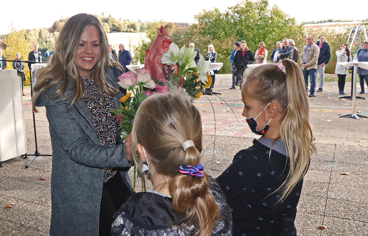 Andrea Marquardt ist offiziell ins Amt als Schulleiterin in Mägerkingen eingesetzt worden. Dafür gab es Blumen von den Schülerinnen und Schülern. FOTO: BLOCHING