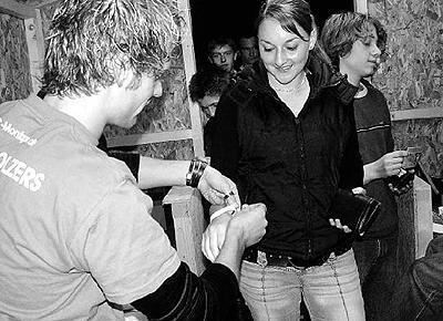 Einlasskontrolle. Erst den Personalausweis zeigen, dann gibt's den entsprechenden farbigen Bändel.