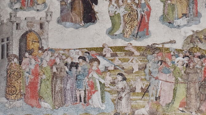 Auf dem Weltgerichtsfresko in der Trochtelfinger Martinskirche von 1480 sind die Pestpatrone Sebastian (erste Gruppe von rechts, links außen mit Pfeil), der Erzengel Michael (vierte Gruppe von rechts, links außen mit Rüstung) und möglicherweise Bernhard von Siena (Vierter von links, vordere Reihe unten mit Gugel als Kopfbedeckung) dargestellt.