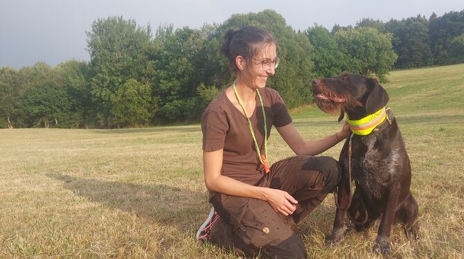 Weiblich, jung, Jägerin: Nadine Kirsch hat ihren Jagdschein 2016 gemacht und ist Pächterin eines Reviers in Sonnenbühl. Mit Hündin Hera geht sie auf Pirsch.