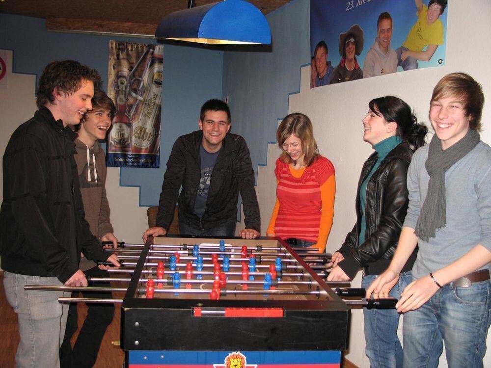 Am Tischkicker von links: Denis Heideker, Marc Link, Mark Strecker, Nathalie Reichenecker, Daniela Tress und Jan Wagner. Weitere Vorstandsmitglieder sind Tim Hägele, Florian Reusch, Felix Eberhardt und Aline Kehrer.