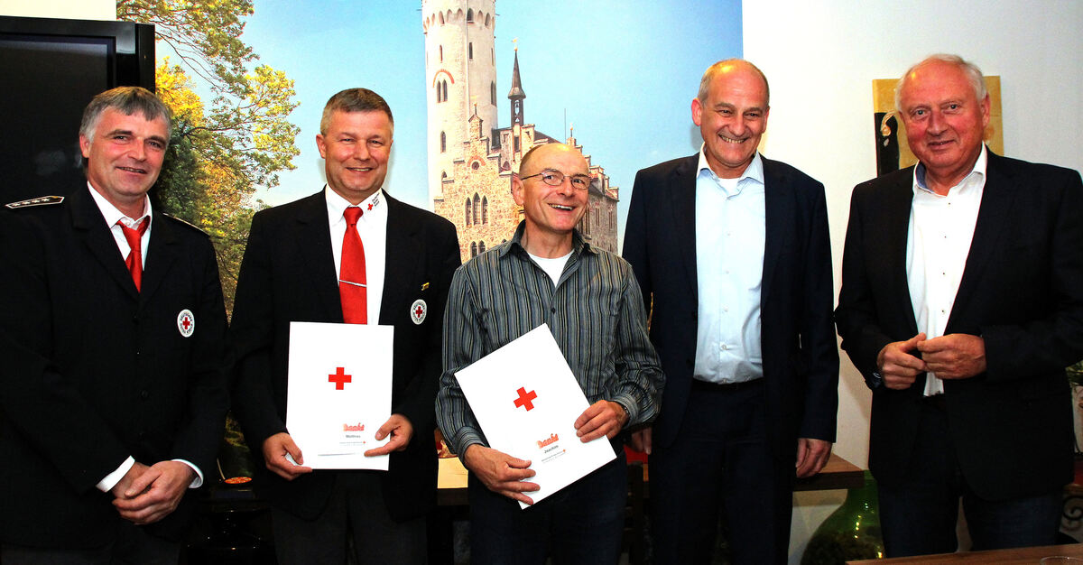 Ehrung bei der DRK-Ortsgruppe Sonnenbühl, von links: Bereitschaftsleiter Andreas Hailfinger, der Vorsitzende der DRK-Ortsgruppe Matthias Bez, Kassier Joachim Eißler, Bürgermeister Uwe Morgenstern und der Präsident des DRK-Kreisverbands Siegfried Mahler.