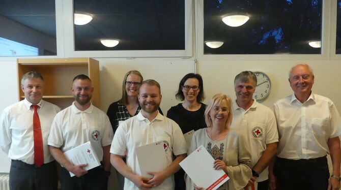 Matthias Bez (links) und Siegfried Mahler (rechts) ehrten Stefan Heinzelmann, Sandra Bez, Caroline Feucht, Andreas Hailfinger (hinten von links) sowie Mike Lamparter und Isabella Möck (vorne).