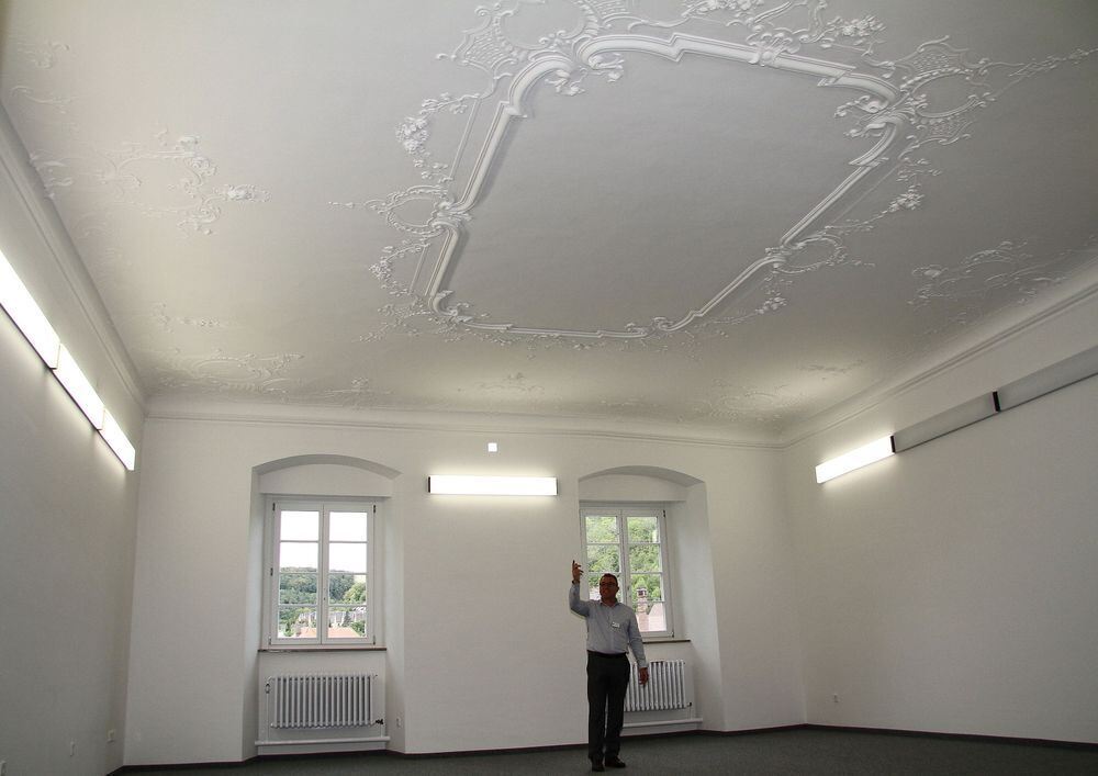 Barocker Schatz an der Decke des künftigen Klassenzimmers: Die Stuckverzierungen waren lange Zeit hinter Deckenplatten verborgen und sind erst vor Kurzem wiederentdeckt worden.