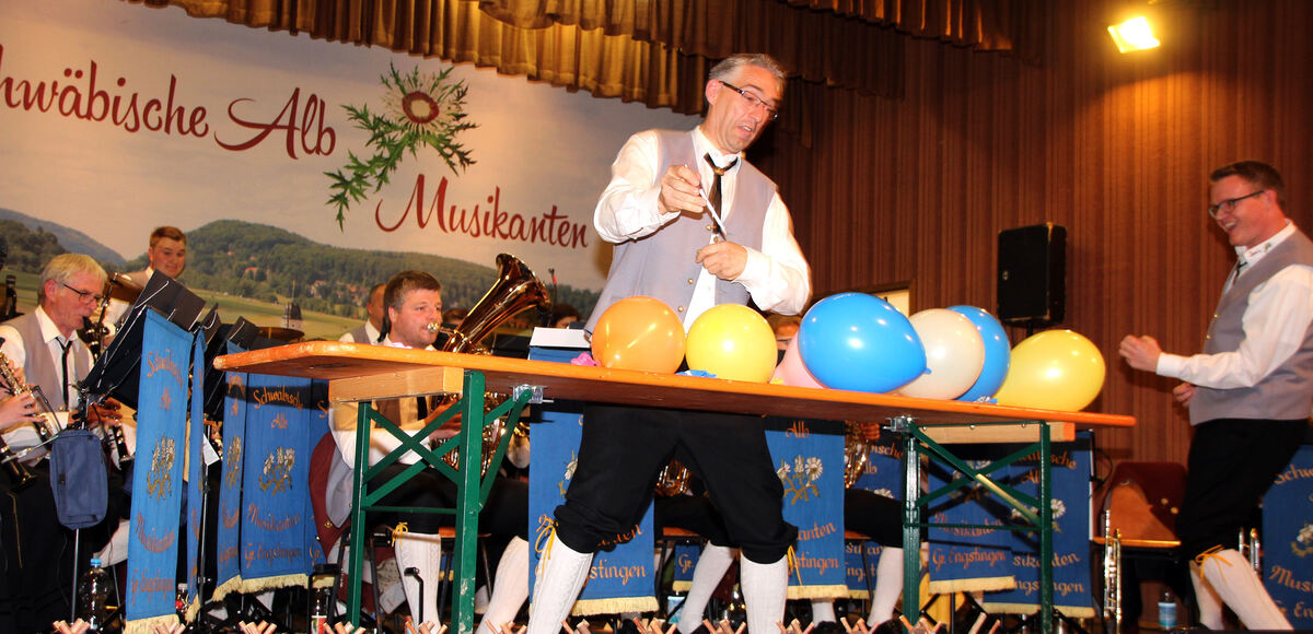 Karl Stockmaier ließ bei der »Luftballon-Polka« zur Freude des Publikums etliche Ballone taktgenau platzen. FOTO: LEIPPERT