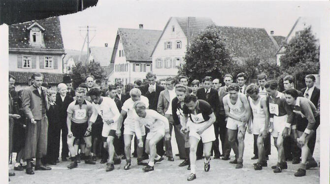 Erinnerung an die frühe Vereinsgeschichte des SV Erpfingen: Im Jahr 1948 fand ein Straßenvolkslauf statt, das Bild zeigt den Start. FOTOS: PRIVAT