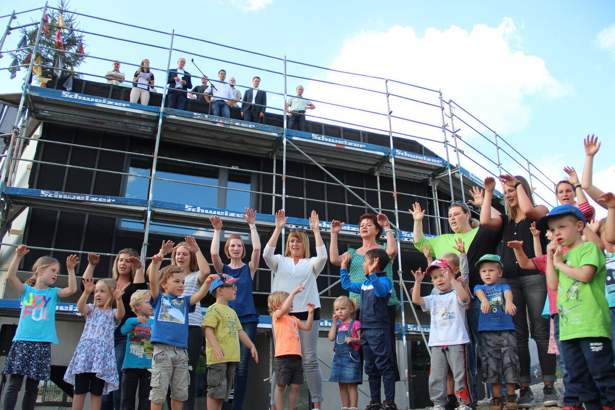 »Das Haus aus Stein bleibt stehen«: Kinder und Erzieherinnen der Undinger Kindergärten sangen beim Richtfest. FOTO: DEWALD