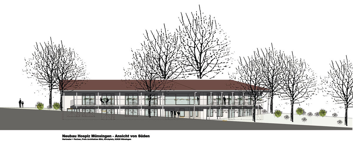Flach und filigran soll sich das Hospiz in die parkähnliche Umgebung des Ehrenmals und der Nachbarhäuser einfügen. GRAFIK: HARTMAIER