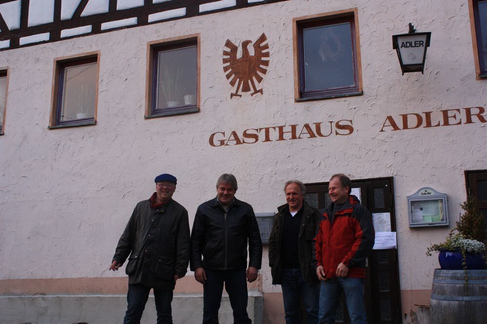 Das Geschäft ist besiegelt: Christian Keller (von links) verkaufte den Meidelstetter Adler an den Förderverein »Zukunft Adler«, vertreten durch Paul Tress, Dieter Schlemonat und Harald Rauscher. FOTO: PR