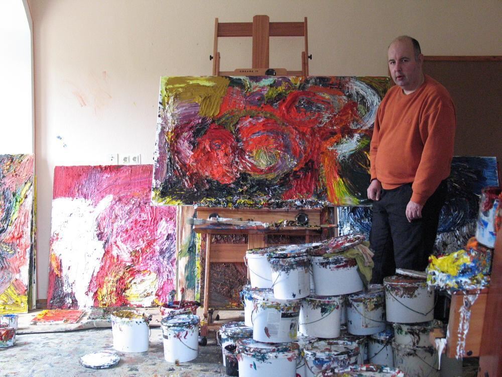 Farbe, eimerweise: Normann Seibold in seinem Atelier im Schloss Grafeneck.