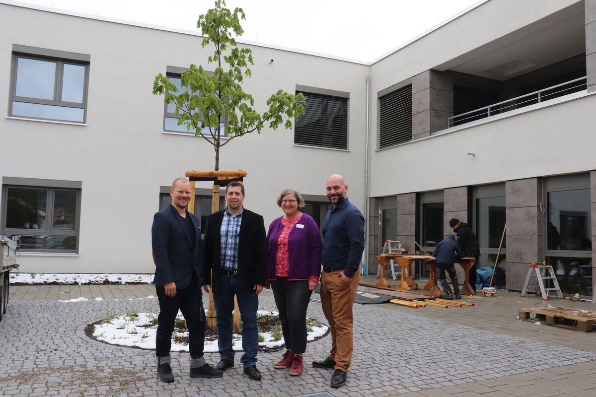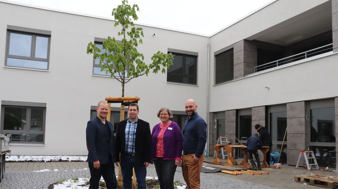 Im Hintergrund wird noch fleißig gewerkelt, im Vordergrund fiebern die Verantwortlichen für das neue Samariterstift in Sonnenbühl, Sixten Schoo (von links), Mladen Gajek, Angela Krohmer und Andrauso Farina, dem Einzug entgegen. FOTOS: PIEHLER