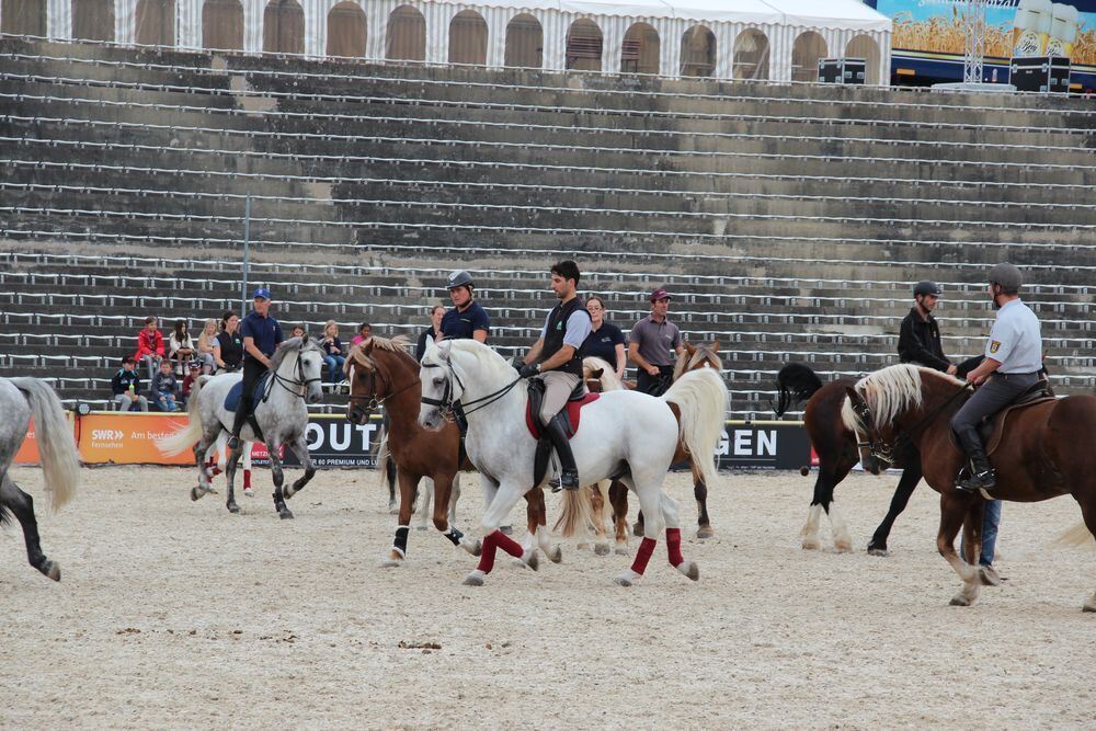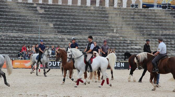 Feinschliff an der Juliäums-Quadrille der Staatsgestüte mit 32 Pferden. Die Rassevielfalt Europas reicht vom Lipizzaner bis zum Schwarzwälder Fuchs. GEA-FOTO: GEIGER