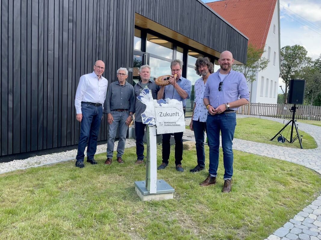Sie würdigen den »Wegweiser Zukunft«: Uli Schwenk (von links), Dieter Kröger (Ortsvorsteher Bleichstetten), Clemens Fischer (Kunstforum), Musiker Rudolf Tigges, Rudolf Teuffel (Kunstforum) und Bürgermeister Florian Bauer. FOTO: OGRZEWALLA