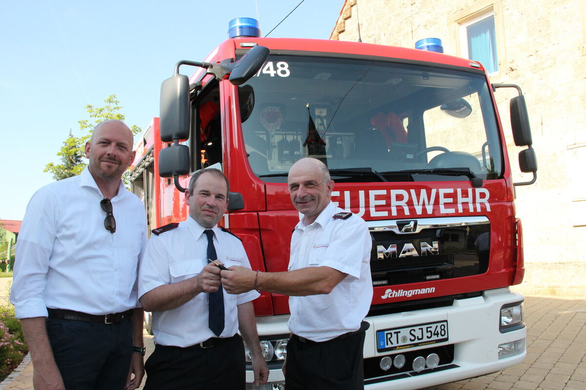 Neues Feuerwehrfahrzeug für Ohnastetten (von links): Bürgermeister Florian Bauer, Abteilungskommandant Matthias Vatter und Gesamtkommandant Ewald Höh. FOTO: DEWALD