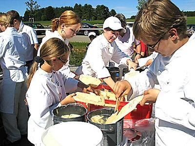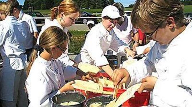 Während die 220 Miniköche schabten, schöpften engagierte Mütter und Väter die fertigen Spätzle in große Eimer.