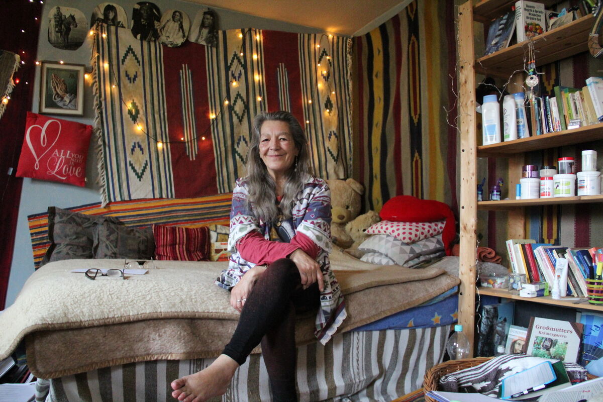 Renate Welz in ihrem Zimmer in der Engstinger Notunterkunft in Kohlstetten. FOTO: DEWALD