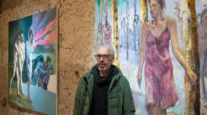 BURLADINGEN-MELCHINGEN. Menschen stehen im Zentrum der Werke, die der Rottenburger Künstler Michael Plaetschke im Foyer des Theaters Lindenhof in Melchingen ausstellt. Im Titel »Viele sind – Wir« steckt auch eine Haltung: Die, allen Menschen den gebührenden Respekt entgegenzubringen, besonders den vielen, die gerne übersehen werden wie Flüchtende, Frauen und Kinder. »Ich bin ein humanistischer Künstler«, sagt Plaetschke über sich selbst. Nach dem Studium der Bildhauerei in Stuttgart standen Skulpturen aus Stein, Holz und Bronze lange im Zentrum seines Schaffens. Erst in den vergangenen Jahren schwenkte er um auf Ölmalerei. Parallel widmet er sich weiterhin dem Holzschnitt.