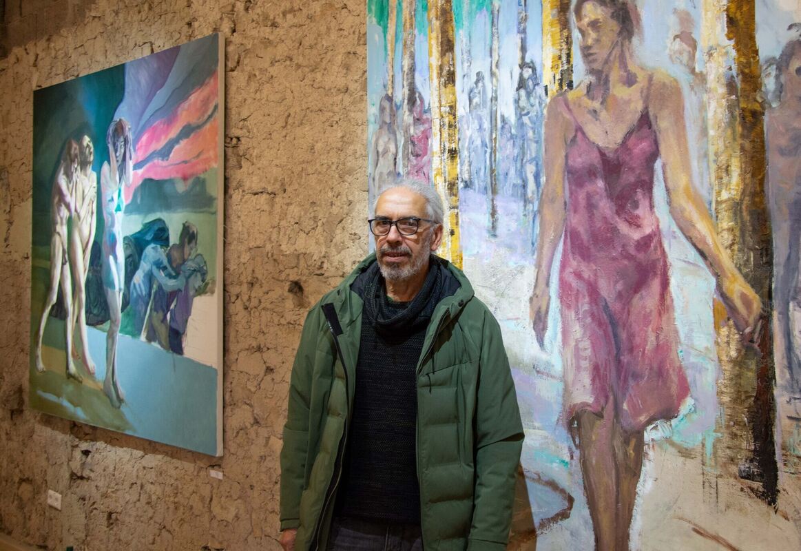 Die ausgestellten großformatigen Bilder stammen hauptsächlich aus den zurückliegenden zwei bis drei Jahren. Was malt man im Angesicht des Krieges, der Flüchtlingswellen und der Pandemie? Auch den Künstler macht all dies betroffen und doch möchte er mit seinen Bildern Hoffnung und Zuversicht vermitteln. Auch wenn sie die Themen der Zeit auf unterschiedliche Weise aufgreifen, sind seine Werke doch nie eindeutig, sondern enthalten irritierende, surreale Elemente. Sie laden den Betrachter dazu ein, seine eigene Geschichte in ihnen zu finden. Flankiert werden die sechs jeweils rund zwei Meter hohen, farbenfrohen Gemälde von Holzschnitten.