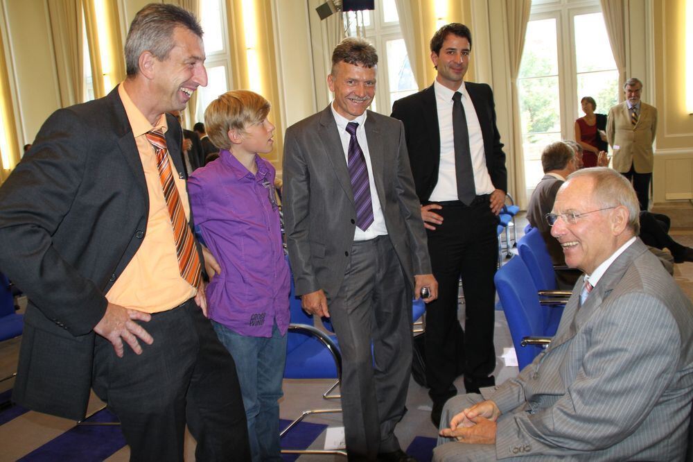 Auf Einladung des Finanzministers war die Familie Erzberger aus Münsingen (von links) Georg, Matthias und Max Erzberger, aus Stuttgart, Ravensburg und Schaffhausen angereist und Wolfgang Schäuble nahm sich die Zeit für persönliche Gespräche. FOTO: IN