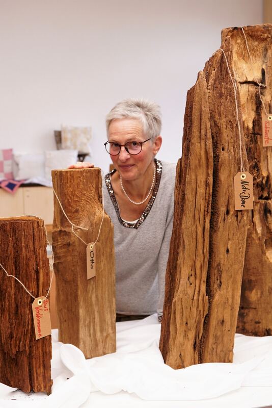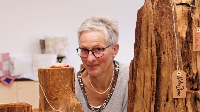 Künstlerin Nina Speidel, die man auch als Oboistin im Orchester der Martinskirche kennt, hat die von Feuchtigkeit, Wurm und Schwamm befallenen Eichenhölzer vor rund einem Jahrzehnt aus dem Container geholt, die bei der Sanierung der Martinskirche ausgebaut worden waren. Noch an Ort und Stellen zersägte sie seinerzeit die rund 950 Jahre alten Überbleibsel. Zuhause hat sie Speidel dann mit dem Hochdruckreiniger und der Drahtbürste gesäubert, bevor dann das Schmirgelpapier zum Einsatz kam. Abschließend hat die gelernte Schreinerin die altertümlichen Kunstwerke noch mit einer Lasur überzogen.