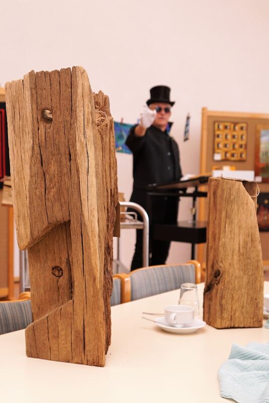 Zu guter Letzt verpasste sie den Unikaten, die sie »ein Stück Geschichte zum Anfassen« nennt, jeweils einen Namen. So kamen am Wochenende zum Beispiel das Eisbein, die Orgelpfeife, die Kegelbahn, der Wasserfall und das Lautertal unter den Hammer. Die Aufgabe des Auktionators übernahm Speidels Mann Carsten, der stilecht im schwarzen Anzug, einen Zylinder auf dem Kopf und weißen Handschuhen die hölzernen Kunstwerke unters Volk brachte. 32 Euro brachten »David und Goliath«, der kleine Hendrik ersteigerte sich für sechs Euro das »Ze-bra«, auch wenn er lieber ein Pony gehabt hätte. Annegret Braun, Ehefrau von Dekan Norbert Braun, holte sich für 28 Euro »Notre Dame« ins Wohnzimmer.