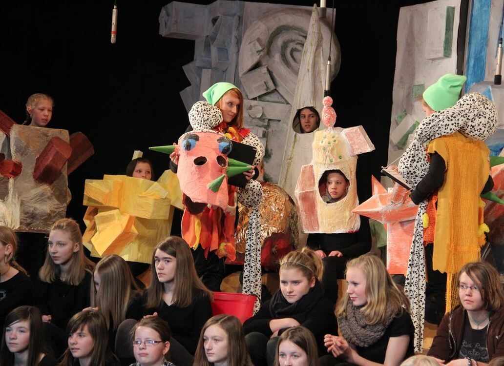 Kennst du die Ursuppe? Annabell Burkhardt brachte sie im Musical des Münsinger Unterstufenchors auf die Bühne. Im Hintergrund eitle und weniger eitle Steine, Kristalle oder Felsspalten, Akteure einer witzigen Reise durch die Erdgeschichte.
