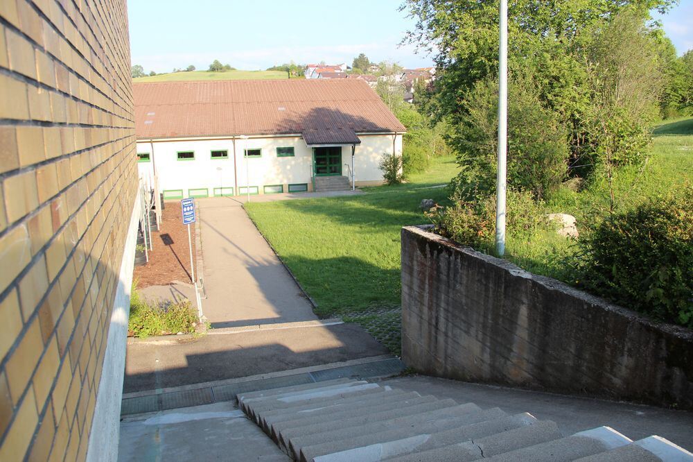 Schon die Treppe, die zum F-Bau der Freibühlschule mit der Turnhalle führt, ist in marodem Zustand, in der Halle selbst sieht’s nicht besser aus. Die Gemeinde Engstingen investiert jetzt über 1,4 Millionen Euro in die Sanierung von Halle und Außenanlagen. GEA-FOTO: DEWALD