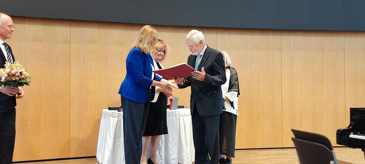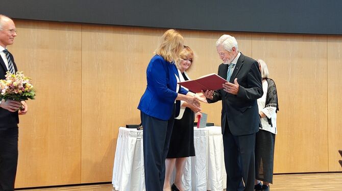 Eberhard Zacher ist in Stuttgart die Urkunde der Otto-Hrsch-Auszeichnung überreicht worden: links die Stuttgarter Bürgermeisterin Isabel Fezer, daneben Barbara Traub von der Israelitischen Religionsgemeinschaft. FOTO: RAHMIG