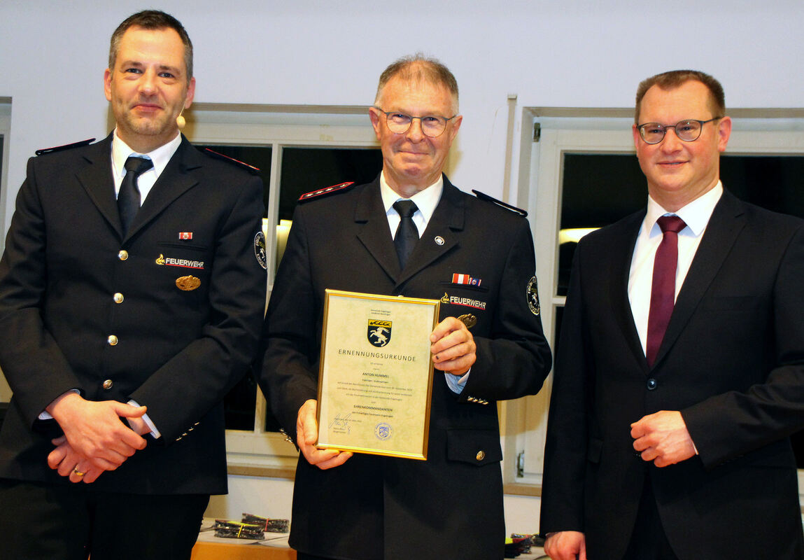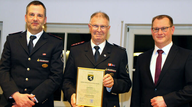 Anton Hummel (Mitte) – flankiert von Gesamtkommandant Daniel Geist(links) und Bürgermeister Mario Storz – wird zum Ehrenkommandant der Feuerwehr Engstingen ernannt.