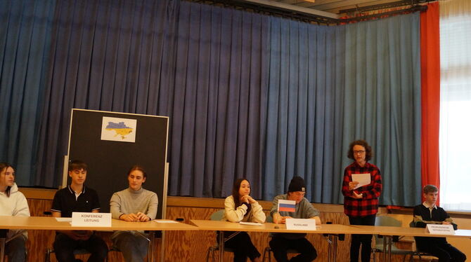 Die Engstinger Schüler sind also nahe dran am Kriegsgeschehen, auch emotional. Trotzdem haben sich für alle »Verhandlungsdelegationen« Freiwillige gefunden, die auch die unpopulären Delegierten Russlands oder der sogenannten Volksrepubliken Donezk und Luhansk im Osten vertreten haben.
