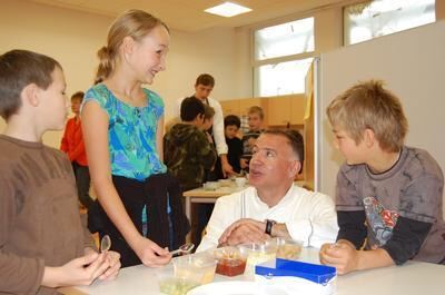 SONNENBÜHL-ERPFINGEN. Gurke, Kiwi oder Kirsche? Grünen, roten und gelben Saft probieren und bestimmen lautete die Aufgabe für die knapp 60 Kinder der Johann-Ludwig-Schneller-Grundschule beim Projekt »Ernährung«. Der Gelbe sei unzweifelhaft Apfelsaft, glaubten die Schüler, was ihnen Augen und Zunge vermittelten. Gut drei Wochen lang steht in der Schule jetzt das Thema Ernährung auf dem Stundenplan. Gestern erzielte der Erpfinger Sternekoch Gerd Windhösel bei der Geschmacksschulung verblüffende Effekte.