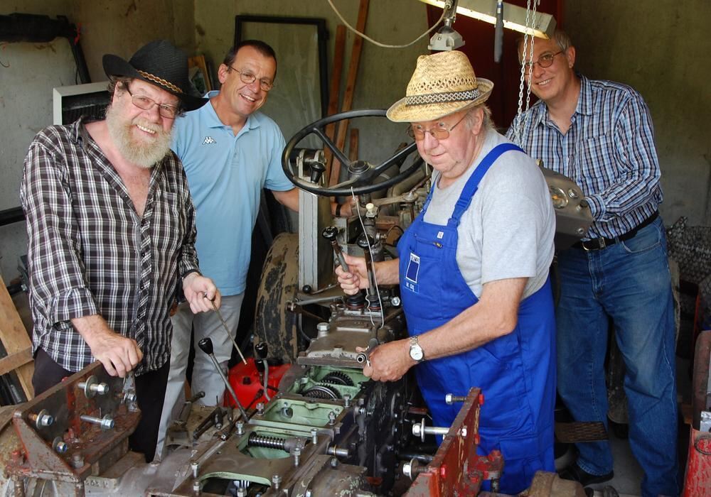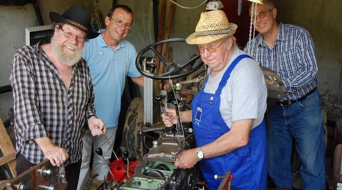 TROCHTELFINGEN. »Bis zur Ernte isch der fertig«, sagt Wendelin Ott im Brustton der Überzeugung, wenn er auf den zerlegten Lanz-Traktor blickt – einzig das schalkhafte Blitzen in den Augen irritiert. »Er sagt nur nie, welches Jahr er meint«, löst Reinhard Klein den Gag auf. Die beiden Traktor-Oldtimerfans Ott und Klein bereiten derzeit mit Helmut Betz, Stefan Ott, Ortsvorsteher Alwin Ott und vielen anderen Mitgliedern des Schützenvereins Steinhilben das erste Oldtimer-Traktortreffen am kommenden Wochenende in Steinhilben vor.