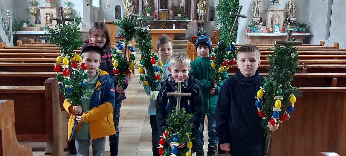 Vor Ostern haben sie Eier gefärbt und Palmenzweige gebastelt und ziehen damit am Palmsonntag in die Kirche ein. Zwei Wochen nach dem Osterfest erhalten die Kinder in St. Pankratius in Steinhilben ihre erste Heilige Kommunion. FOTO: FISCHER
