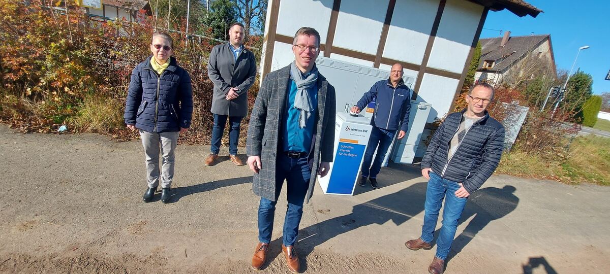 Auf der Haid wurde Glasfaser verlegt, circa 40 Häuser sind nun direkt mit schnellem Internet versorgt. Vor dem Verteilerkasten geben Beate Ernst (Stadtbauamt), Mark Latkowski (BLS), Bürgermeister Christoph Niesler, Matthias Troppmann (NetCom BW) sowie Gemeinderat und Haid-Bewohner Peter Hack (von links) das Netz frei.