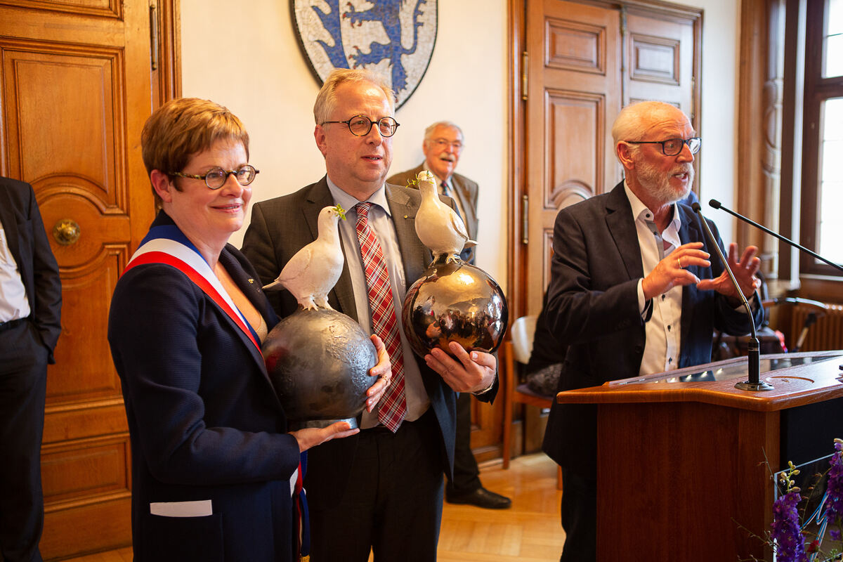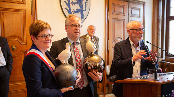 Geschenke erhalten die Freundschaft: die Bürgermeister Christine Métoir und Holger Jerg mit dem Künstler Gernot Bitzer. FOTO: LEUSCHKE
