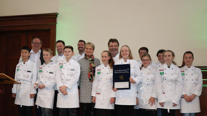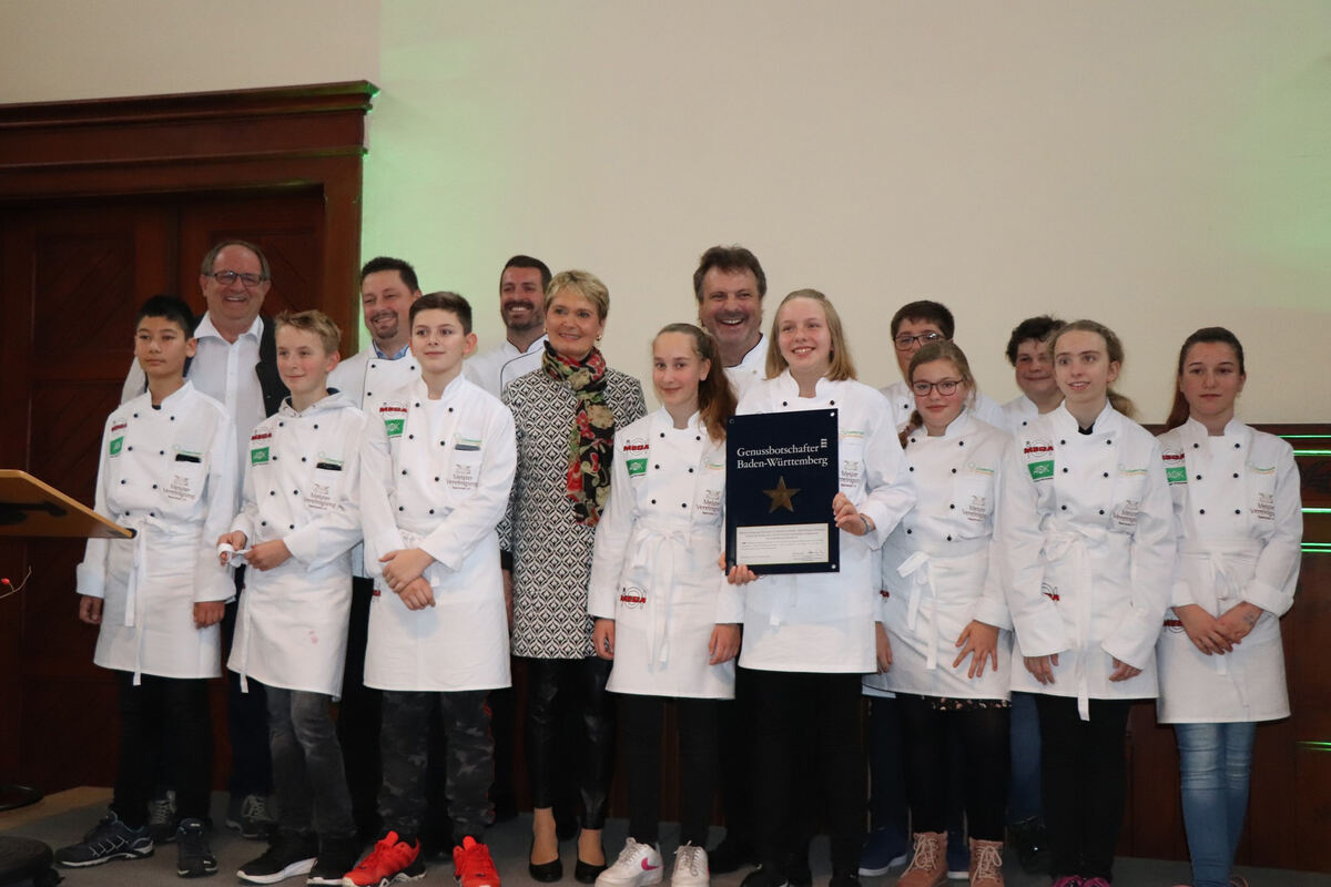 Heiner Beck wurde ebenso wie die Schlemmerbande mit Uwe Staiger, Matthias Kübler und Alfons Köhler (hintere Reihe von links) von Staatssekretärin Friedlinde Gurr-Hirsch zum Genussbotschafter ernannt. foto: bloching